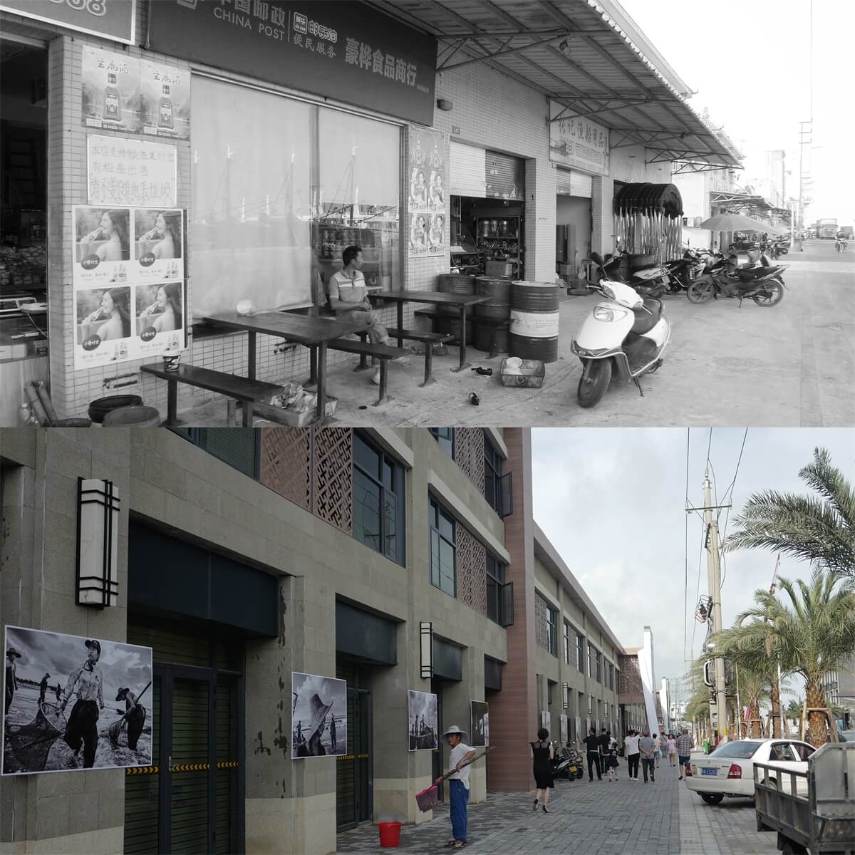 该项目位于中国十大渔港之一的千年古渔港-博贺渔港,经历千年时光浸润至今,该场地现状可见建筑较为破旧,周边环境较为脏乱,交通流线不明朗,急需提升优化体现千年渔港文化韵味,建筑立面改造设计提取茂名当地古典建筑语言,运用现代材料表达,同时优化现有室外空间功能,融入特色海洋元素,打造既有浓郁海味古韵,同时兼顾当地村民现代生活方式的文化古港景观。